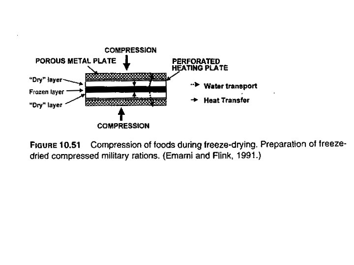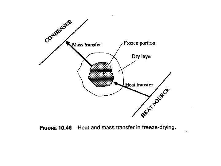 Mass transfer during freeze drying • When heat reaches the sublimation front, it raises the temperature and the water vapor pressure of the ice. Vapor then move through the dried food to a region of low vapor pressure in the drying chamber. • 1 g of ice forms 2 m 3 of vapor at 67 Pa.