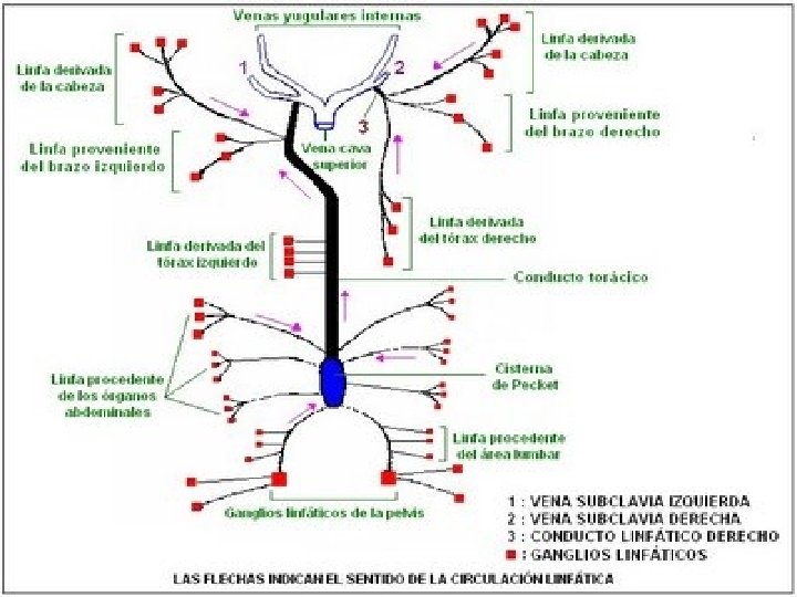 • Al Terminus derecho va a parar el Conducto linfático derecho, de mayor calibre que el torácico. Recoge la linfa de la parte derecha de la cabeza, cuello, tórax y MSD. • Al Terminus izquierdo va a parar el conducto torácico. Este se inicia a la altura de la 2ª vértebra lumbar y 10ª dorsal, en la Cisterna de Pecquet. Asciende pegado a la columna vertebral. Recoge la linfa de los MMII, abdomen, parte izq. del tórax, MSI y parte izq. de cuello y cabeza. .