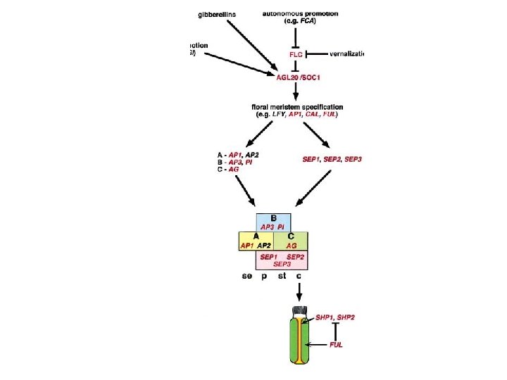 Implicati i repressori trascrizionali RGA e GAI (fattori GRAS o proteine DELLA) Azione ridondante Mutazioni RGA e GAI sopprimono il difetto di fioritura nei mutanti ga 1 -3 promozione della espressione di LEAFY Trovato un elemento cis- nel promotore di LFY che risponde a GA ma non al fotoperiodo