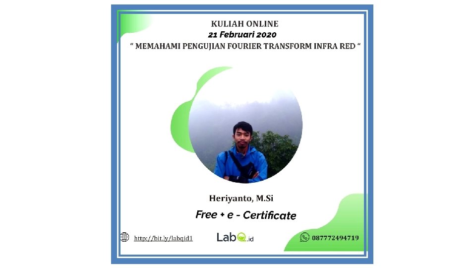 Qn. A Q : Apakah sample dalam cuplikan yang dibuat tersebut bisa diketahui Konsentrasinya kak. A: Bisa dengan cara metode kuantitatif dan harus spesifik pada bilangan gelombang tertentu, bisa menggunakan persamaan lambert-beer. Q : Kalau Sample nya di jadikan Fushion Glass Bead apakah bisa terbaca juga kak. Terimakasih atas waktunya. A: Sampel dalam kaca? bisa asalkan kaca yang digunakan tipis. 19)