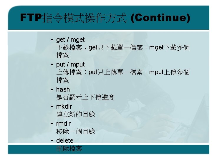 FTP傳輸模式 • Passive mode – Client Sends the PASV command to Server – Server open a port for the data connection and return the address of that port. – Server listens on that port and the client connects to it. • Active mode – Client Sends the PORT command to server – Client listens on a port and sends that address to the remote server, who connects back to it.