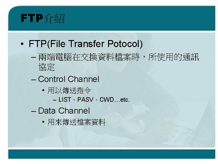 FTP傳輸模式 – Passive mode 使用者 FTP伺服器 進行連線(建立Control Channel) 設定被動傳輸模式 (下達 PSAV Command) ØServer 開啟一個 Port Ø利用 Control Channel 通知 Client 開哪個Port 進行連線(建立 Data Channel) 由 Server 傳送檔案資料到 Client