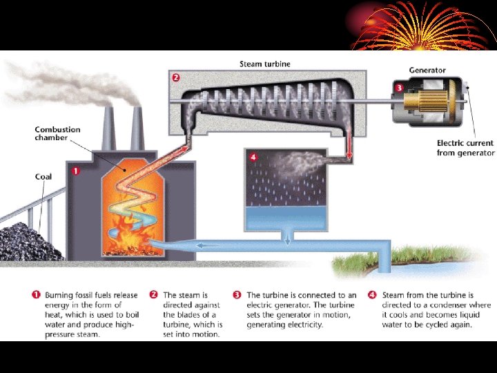 How a Coal-Fired Power Plant Works • Fossil fuels are burned to release heat. • Heat boils water to produce steam. • Steam turns the blades of a turbine. • The turbine sets the generator in motion. • Electricity is generated.