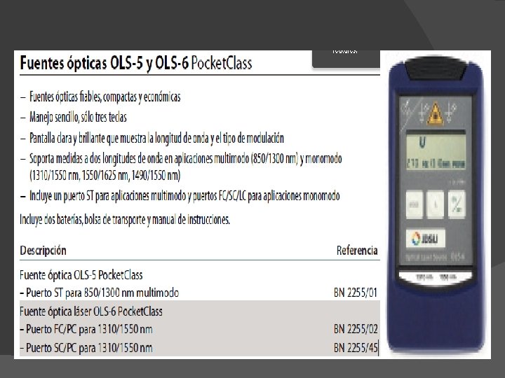 EQUIPOS DE FUENTES OPTICAS Fuente de láser óptico Simpli. Fiber de Linealidad de las mediciones ± 0, 1 d. B 3 (1. 310 nm y 1. 550 nm) Simpli. Fiber 1310 1. 310 nm. Comprobación de fibra ± 0, 2 d. B 4 (850 nm). Especificaciones del entorno. Fuente de láser óptico Simpli. Fiber de Temperatura de funcionamiento: De 0° a 40° C Simpli. Fiber 1550 1. 550 nm. Comprobación de fibra