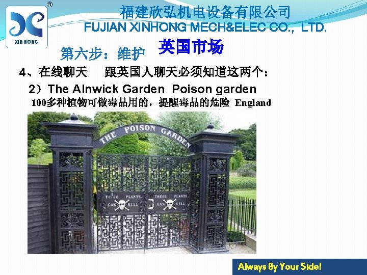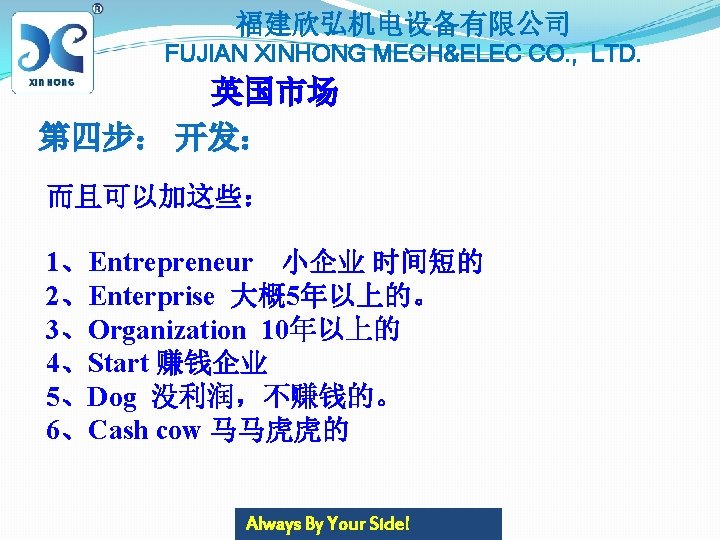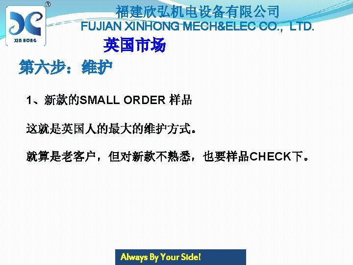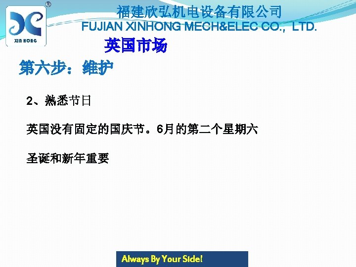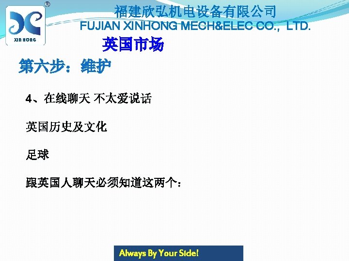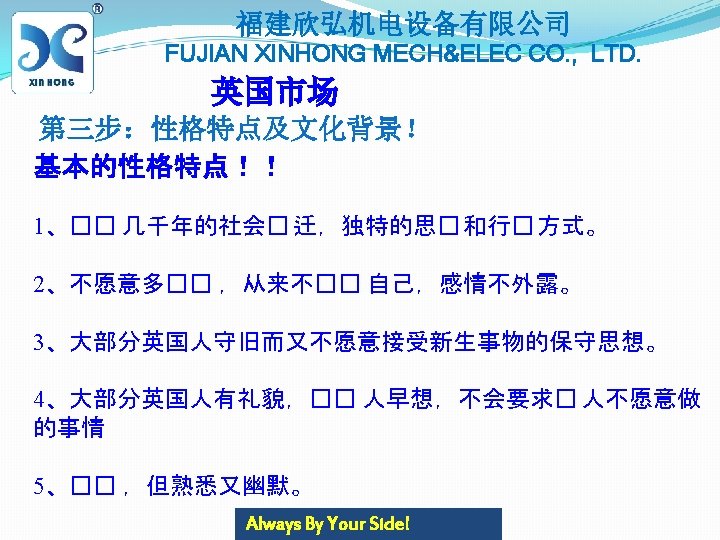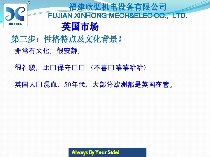 福建欣弘机电设备有限公司 FUJIAN XINHONG MECH&ELEC CO. , LTD. 英国市场 第二步:分析客户 Always By Your Side!