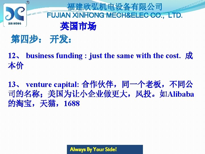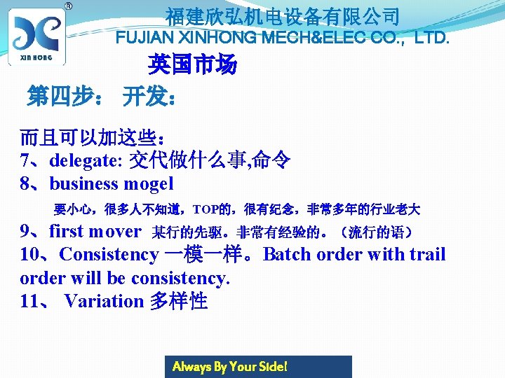 福建欣弘机电设备有限公司 FUJIAN XINHONG MECH&ELEC CO. , LTD. 英国市场 回复 3、PEOPLE PERSON: MR MIKE LEE IS OUR SALES MANAGER, HE IS REAL PEOPLE PERSON. 优秀人 4、Crunch the number: After Crunching the numbers the big boss informed me that we can’t accept your target price. 多次核算,真的没办法达到你的目标价 Always By Your Side!