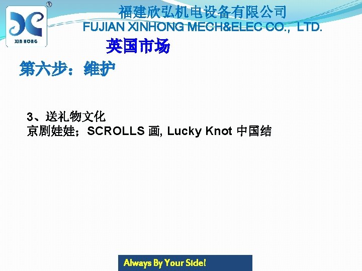 福建欣弘机电设备有限公司 FUJIAN XINHONG MECH&ELEC CO. , LTD. 英国市场 回复 7、Think outside the box. We need to produce new design, let us THINK OUTSIDE THE BOX. 8、Win-win situation We hope we could establish win-win situation. 9、Test the water: We are test the water to see if changing the new designs. Always By Your Side!