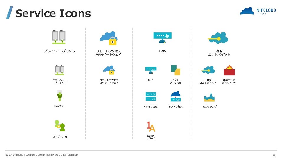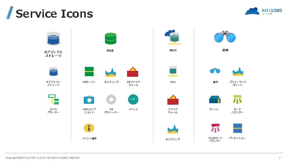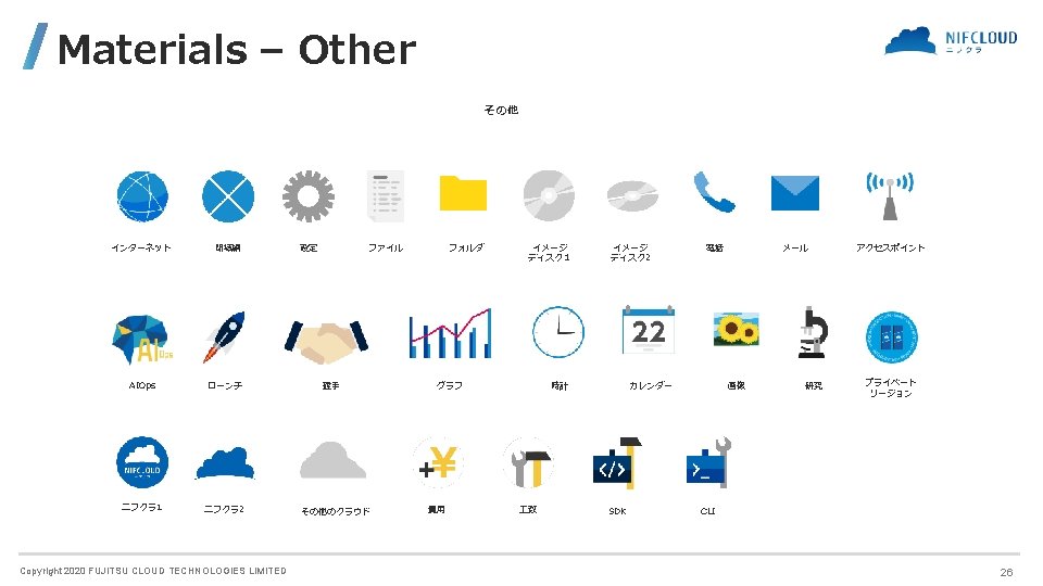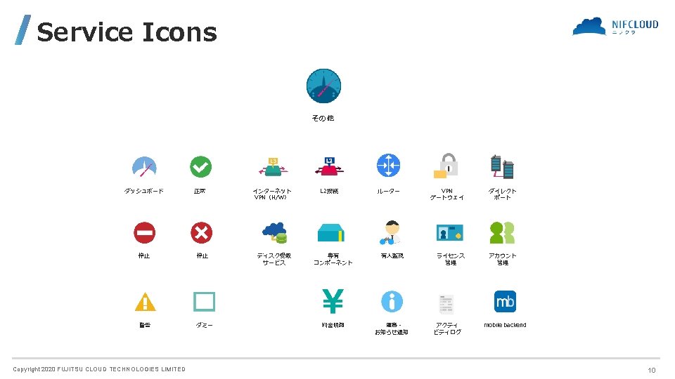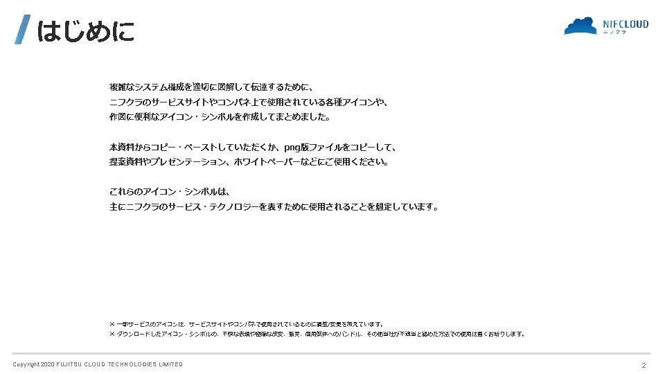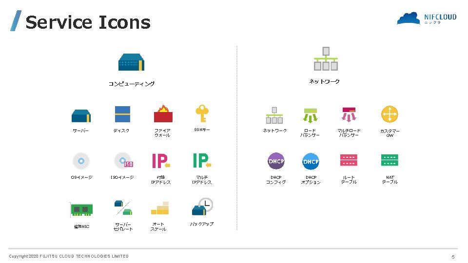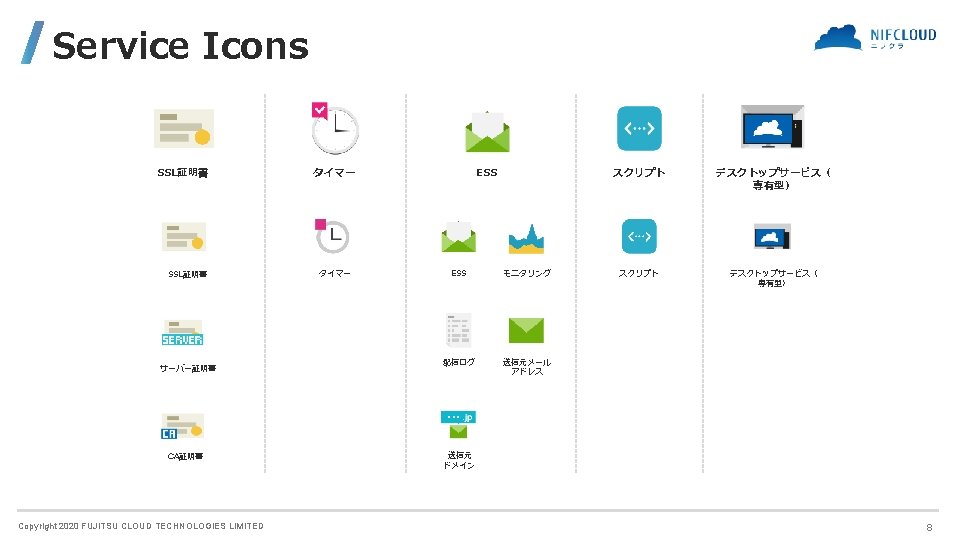 FUJITSU CLOUD TECHNOLOGIES LIMITED 富士通クラウドテクノロジーズ株式会社 ニフクラ Icons and Symbols Copyright 2020 FUJITSU CLOUD TECHNOLOGIES LIMITED