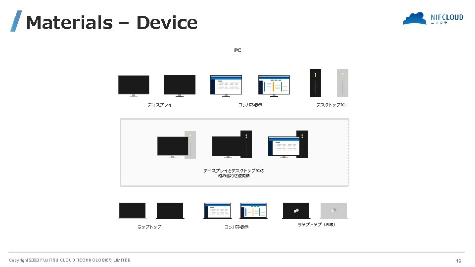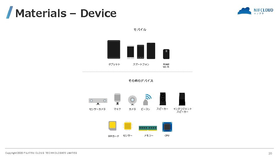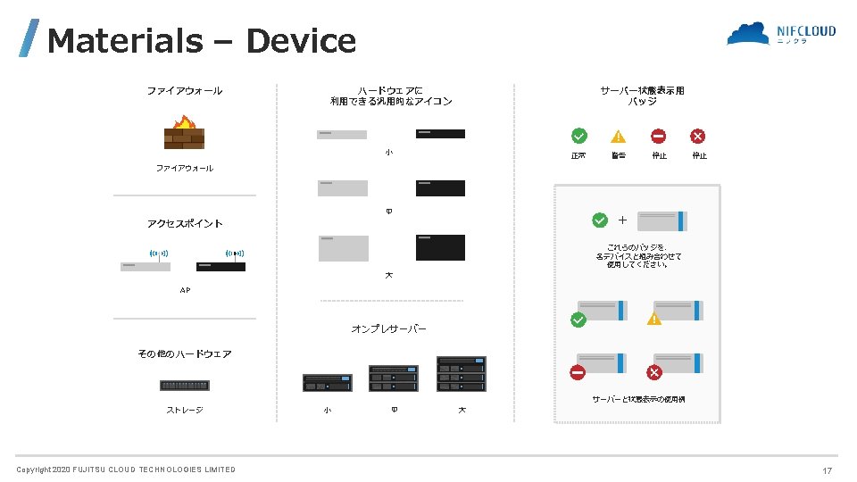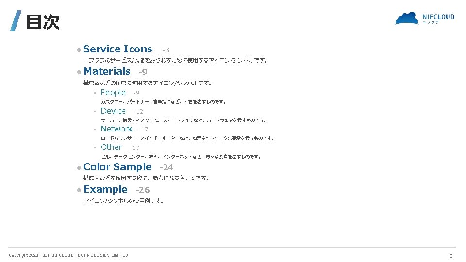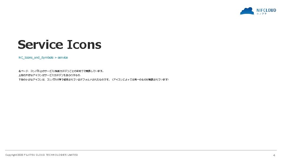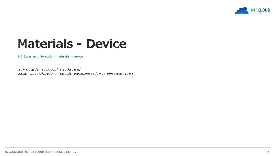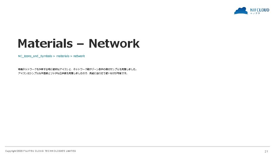 FUJITSU CLOUD TECHNOLOGIES LIMITED 富士通クラウドテクノロジーズ株式会社 ニフクラ Icons and Symbols Copyright 2020 FUJITSU CLOUD TECHNOLOGIES LIMITED