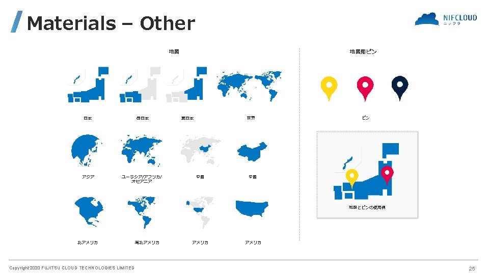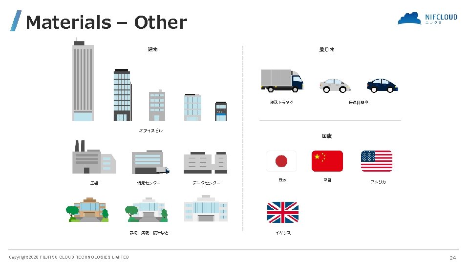 Materials - Other NC_Icons_and_Symbols > materials > other 資料作成時に便利なクリップアート類を各種用意しました。 Copyright 2020 FUJITSU CLOUD TECHNOLOGIES LIMITED 23