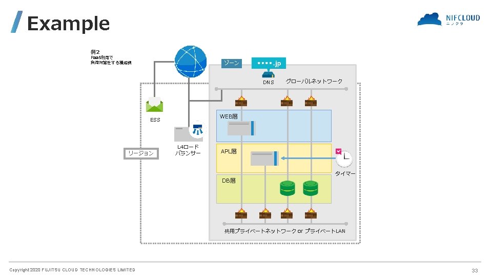 Example 例1 お客様環境 VPN装置 プライベートLAN ソフトウェア VPN Copyright 2020 FUJITSU CLOUD TECHNOLOGIES LIMITED 32