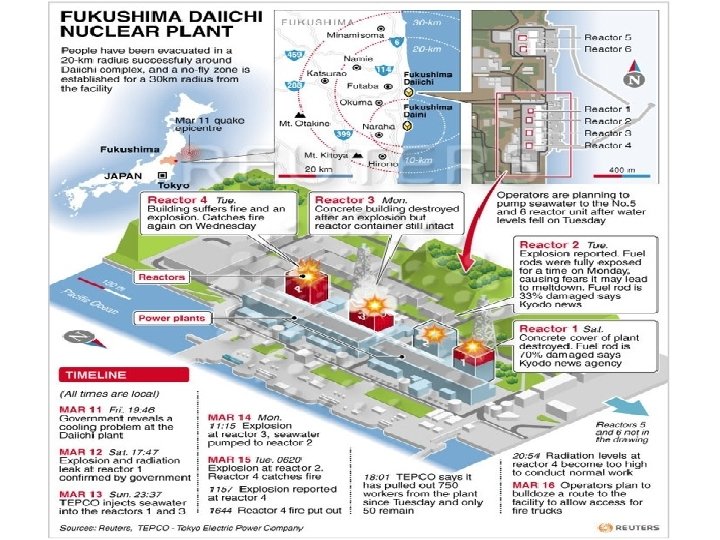 Event Chronology – Cooling Strategy • The station was able to deploy portable generators and utilize a portable pump to inject sea water into the reactor and primary containment. • Station was successful in flooding the primary containment to cool the reactor vessel and debris that may have been released into the primary containment. • Boric acid was added to the seawater used for injection. Boric acid is “liquid control rod”. The boron captures neutrons and speeds up the cooling down of the core. Boron also reduces the release of iodine by buffering the containment water p. H. Containment Flooding Effects