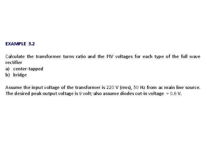 EXAMPLE 3. 2 Calculate the transformer turns ratio and the PIV voltages for each type of the full wave rectifier a) center-tapped b) bridge Assume the input voltage of the transformer is 220 V (rms), 50 Hz from ac main line source. The desired peak output voltage is 9 volt; also assume diodes cut-in voltage = 0. 6 V.