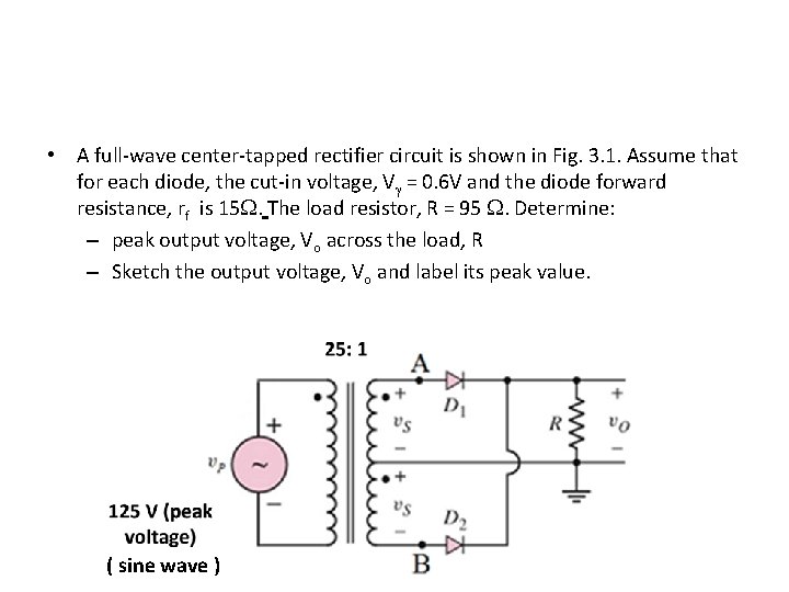 • A full-wave center-tapped rectifier circuit is shown in Fig. 3. 1. Assume that for each diode, the cut-in voltage, V = 0. 6 V and the diode forward resistance, rf is 15. The load resistor, R = 95 . Determine: – peak output voltage, Vo across the load, R – Sketch the output voltage, Vo and label its peak value. ( sine wave )