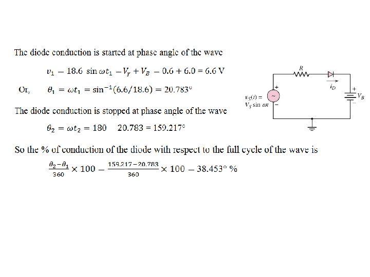 EXAMPLE 3. 1 – Half Wave Rectifier Determine the currents and voltages of the half-wave rectifier circuit. Consider the halfwave rectifier circuit shown in Figure. Assume and . Also assume that Determine the peak diode current, maximum reverse-bias diode voltage, the fraction of the wave cycle over which the diode is conducting. -VR + VB + 18. 6 = 0 VR = 24. 6 V - VR + + A simple half-wave battery charger circuit