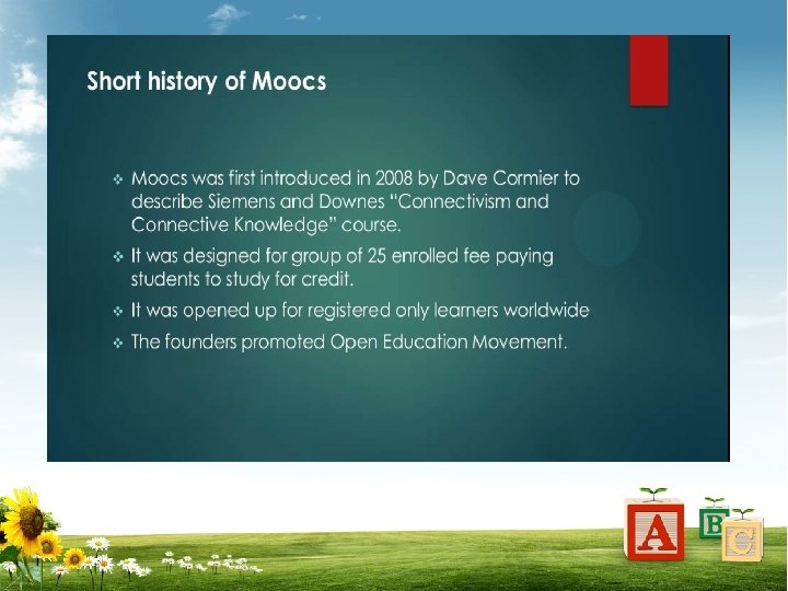 • One of the first MOOC in 2008 had 2200 registered members but only 150 of them appeared the final tests and the same trend of having less than 10% completion rate is seen till now. • This is a great oppertunity for us but we are not ready to use it.