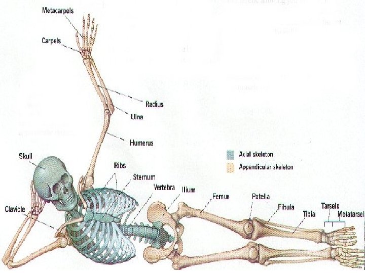 Fun facts! • Skeleton is the bony framework of the body • 206 bones in an adult • Four Functions: – Support structure and shape – Protect vital organs – Movement and anchorage of the muscles • Tendons • Ligaments – Mineral storage, calcium and phosphorus – Blood cell formation, hematopoiesis