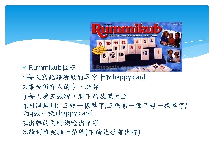 Sentence Describe the pic and make up a story (Dixit) 1. 每人六張牌 2. 說書人抽一張牌描述卡片I see_____. 3. 其他人選出他說的那張牌 4. 將選出的6張牌洗牌 5. 選牌 Sentence cube Roll the dice and write the sentence. I like apples