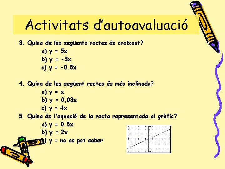 Activitats d’autoavaluació 3. Quina de les següents rectes és creixent? a) y = 5 x b) y = -3 x c) y = -0. 5 x 4. Quina de les següent rectes és més inclinada? a) y = x b) y = 0, 03 x c) y = 4 x 5. Quina és l'equació de la recta representada al gràfic? a) y = 0. 5 x b) y = 2 x c) y = no es pot saber