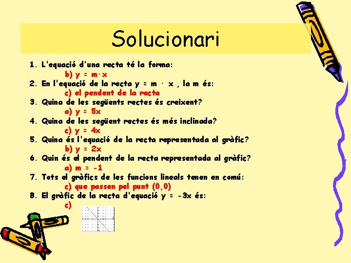 Solucionari 1. L'equació d'una recta té la forma: b) y = m·x 2. En l'equació de la recta y = m · x , la m és: c) el pendent de la recta 3. Quina de les següents rectes és creixent? a) y = 5 x 4. Quina de les següent rectes és més inclinada? c) y = 4 x 5. Quina és l'equació de la recta representada al gràfic? b) y = 2 x 6. Quin és el pendent de la recta representada al gràfic? a) m = -1 7. Tots el gràfics de les funcions lineals tenen en comú: c) que passen pel punt (0, 0) 8. El gràfic de la recta d'equació y = -3 x és: c)