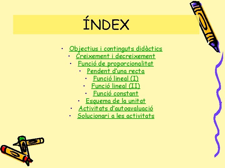 ÍNDEX • Objectius i continguts didàctics • Creixement i decreixement • Funció de proporcionalitat • Pendent d’una recta • Funció lineal (I) • Funció lineal (II) • Funció constant • Esquema de la unitat • Activitats d’autoavaluació • Solucionari a les activitats