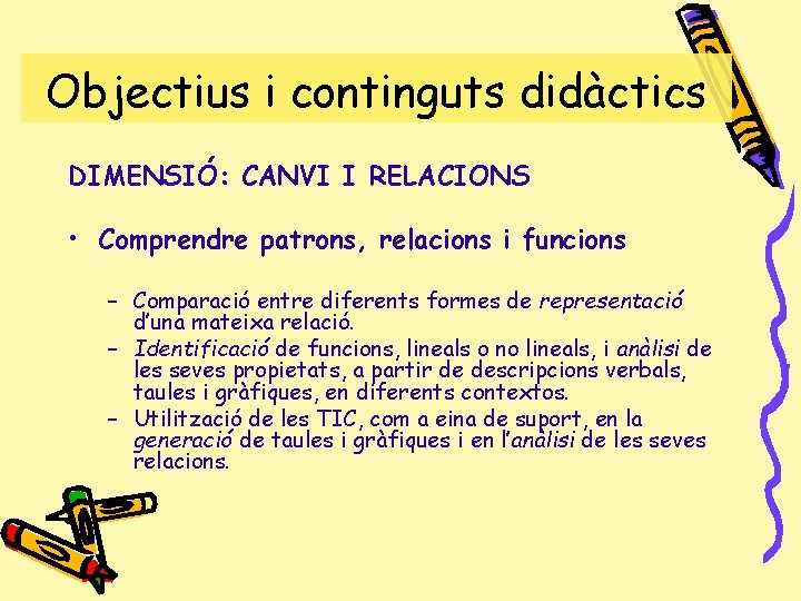 Objectius i continguts didàctics DIMENSIÓ: CANVI I RELACIONS • Comprendre patrons, relacions i funcions – Comparació entre diferents formes de representació d’una mateixa relació. – Identificació de funcions, lineals o no lineals, i anàlisi de les seves propietats, a partir de descripcions verbals, taules i gràfiques, en diferents contextos. – Utilització de les TIC, com a eina de suport, en la generació de taules i gràfiques i en l’anàlisi de les seves relacions.
