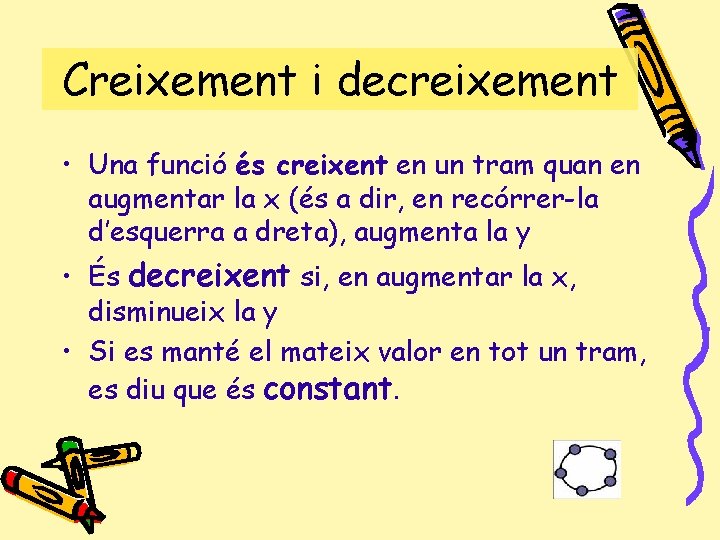Creixement i decreixement • Una funció és creixent en un tram quan en augmentar la x (és a dir, en recórrer-la d’esquerra a dreta), augmenta la y • És decreixent si, en augmentar la x, disminueix la y • Si es manté el mateix valor en tot un tram, es diu que és constant.