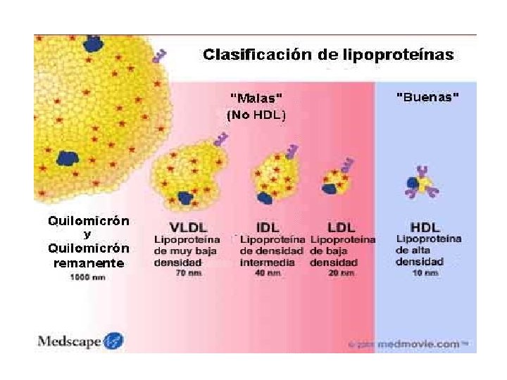 Clases de Lipoproteínas Tipo Lípido principal transportado Quilomicrones Triglicéridos (intestinales) VLDL Triglicéridos (del hígado) LDL Colesterol esterificado (CE) HDL Colesterol