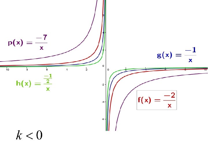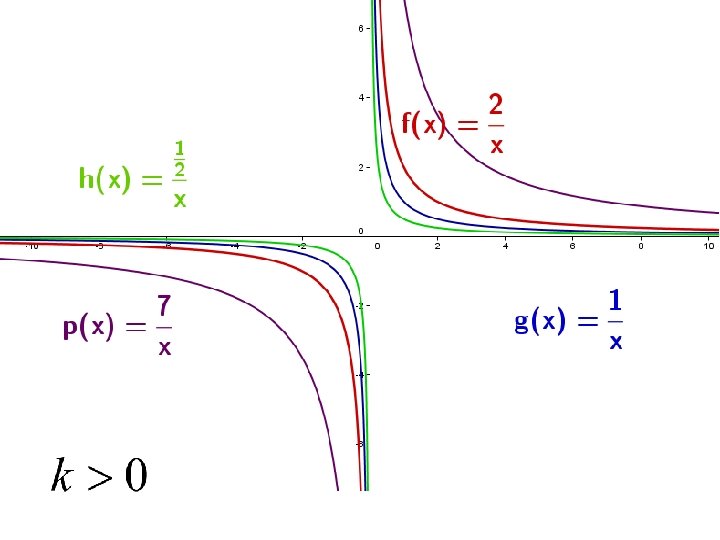 B. FUNCIONES RACIONALES Función de proporcionalidad inversa • En la gráfica de una función de proporcionalidad inversa, k es el área del rectángulo cuyos vértices opuestos son un punto cualquiera P(x, y) de la hipérbola y el punto de corte de las asíntotas. La constante k es positiva si la hipérbola es decreciente, y es negativa si la hipérbola es creciente.