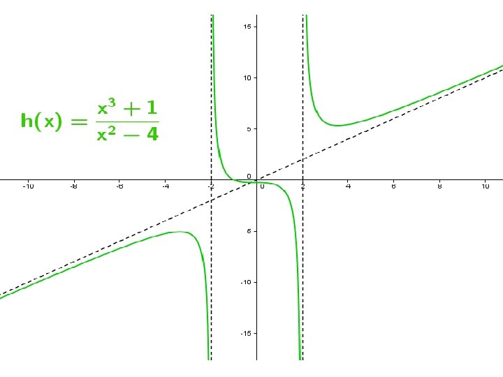 B. FUNCIONES RACIONALES General Estudio Dominio todos los números reales excepto aquellos en los que se anula el denominador, es decir, Q(x)=0. En esos puntos puede tener asíntotas verticales u oblicuas. Asíntotas: • Puede presentar una asíntota horizontal si el grado del numerador es menor o igual al denominador. • También tiene una asíntota oblicua si el grado del numerador es uno más que el denominador. Las posibles asíntotas verticales provienen de las raíces del denominador. Para un mejor estudio de las asíntotas es necesario el conocimiento de límites de funciones.