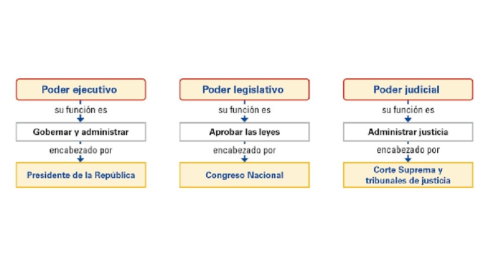 El Estado chileno • Estado unitario y de derecho. • Las funciones del estado se encuentran divididas en 3 poderes distintos: Ejecutivo, Legislativo y Judicial.