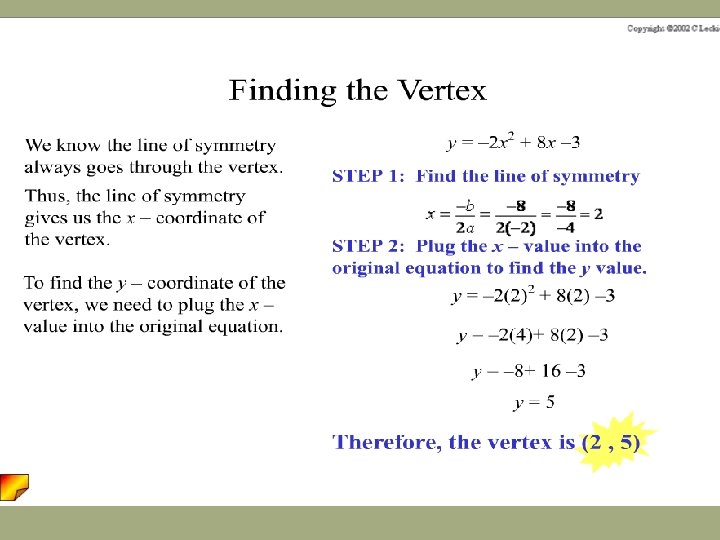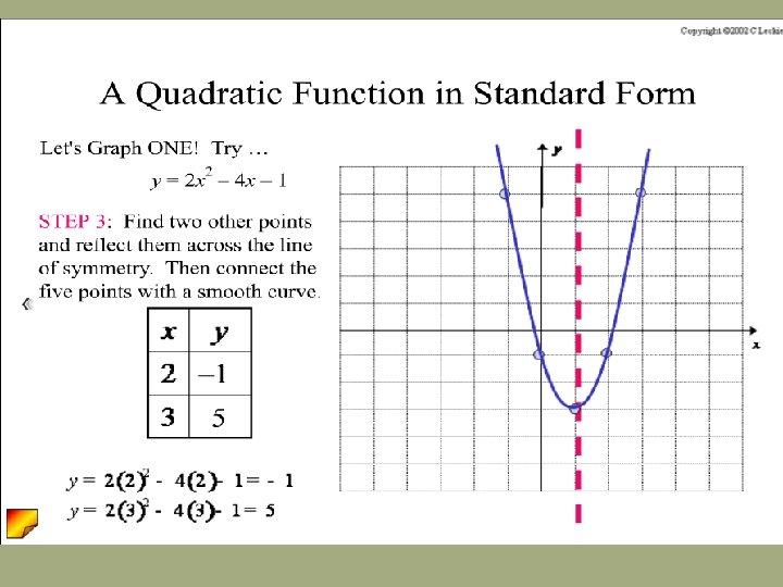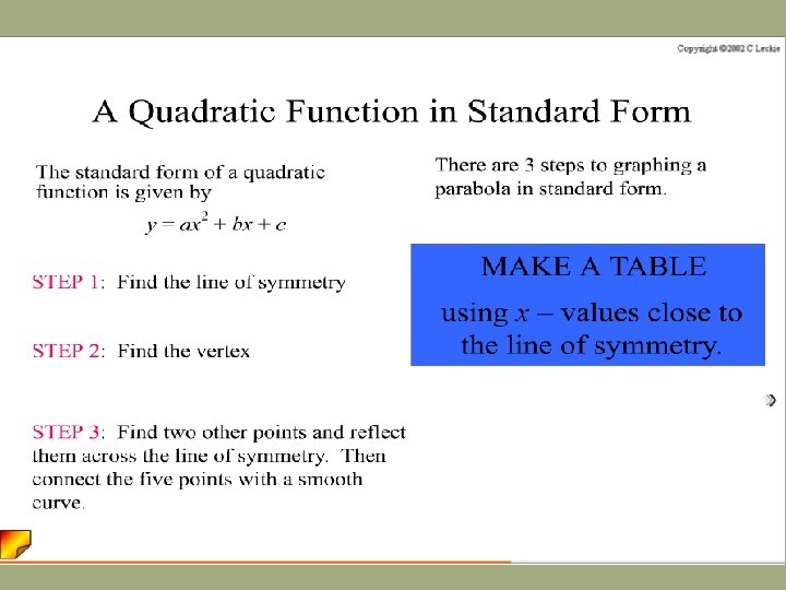 The value of f(x) = 3 x when x = 2 is f(2) = 32 = 9 The value of f(x) = 3 x when x = – 2 is f(– 2) = 3– 2 = The value of g(x) = 0. 5 x when x = 4 is g(4) = 0. 54 = 23 Copyright © by Houghton Mifflin Company, Inc. All rights reserved