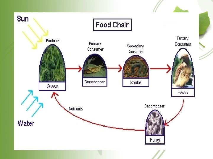 Food Chain • The sequence of eating and being eaten in an ecosystem is known as food chain. • All organisms, living or dead, are potential food for some other organism and thus there is essentially no waste in the functioning of natural ecosystem. • e. g. , grass-> grass hopper-> frog-> snake -> hawk(grass land ecosystem)
