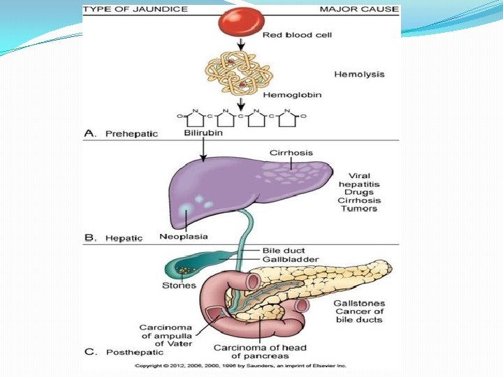 Type & Cause of Jaundice Ø Pre-hepatic Jaundice Ø Intra-Hepatic Jaundice ü Neonatal ü Acute Viral hepatitis (Physiological) Jaundice ü Alcohol Cirrhosis ü Malaria ü Cirrhosis of Liver ü G 6 PD deficiency ü Primray Biliary Cirrhosis, ü Thalassaemia ü Haemochromatosis ü Sickle cell disease ü Wilson Disease ü Mis-match Blood ü Alpha-1 antitrypsin deficiency Transfusion ü Drug induce – Quinine Group, ü Auto-immune NSAID, Chemotherapeutic drugs Ø Post Hepatic Jaundice ü Gall Bladder - Common Bile Duct - Pancreatic duct Stone ü Gall Bladder - Hepatic – Pancreatic – Duodenal Carcinoma