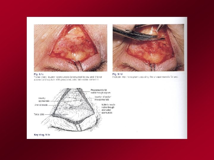 Orbital septum Thin fibrous tissue Upper lid -superior orbital rim periosteum – fuses with the levator aponeurosis 2 -5 mm above the superior tarsal border Lower lid – inferior orbital rim periosteum – capsulopalpebral fascia – together attach to the inferior border of the tarsal plate