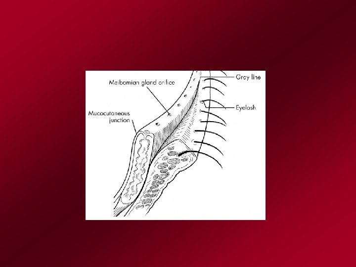 Eyelid margin • Mucocutan junction = gray line avascular zone border between the anterior and posterior part of the eyelid (isolated section of pretarsal orbicularis muscle (Riolan) just anterior to the tarsus) • Eyelashes and glands ( Meibomian gland orifices)