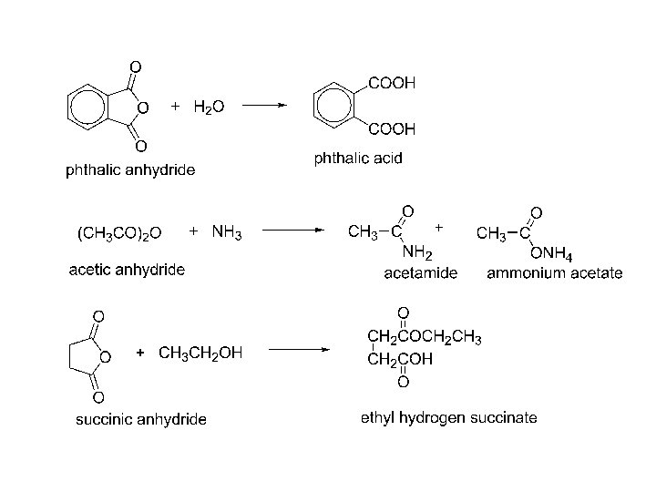 Anhydrides, syntheses: Buy the ones you want! Anhydrides, reactions: 1) Conversion into carboxylic acids and derivatives. 2) a) hydrolysis 3) b) ammonolysis 4) c) alcoholysis 5) 2) Friedel-Crafts acylation
