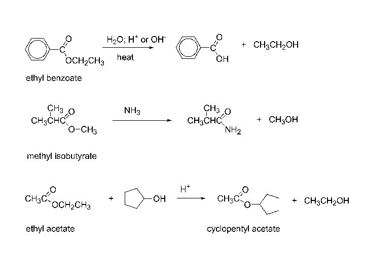 Esters, reactions: 1) Conversion into acids and derivatives 2) a) hydrolysis 3) b) ammonolysis 4) c) alcoholysis 2) Reaction with Grignard reagents 3) Reduction 4) a) catalytic 5) b) chemical 6) 4) Claisen condensation