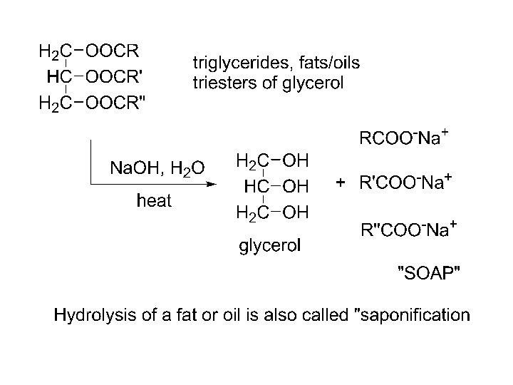 Esters, syntheses: 1) From acids 2) RCO 2 H + R’OH, H+ RCO 2 R’ + H 2 O 2) From acid chlorides and anhydrides 3) RCOCl + R’OH RCO 2 R’ + HCl 3) From esters (transesterification) 4) R’OH 5) R’ONa RCO 2 R’ + R”OH, H+ RCO 2 R’ + R”ONa RCO 2 R” +