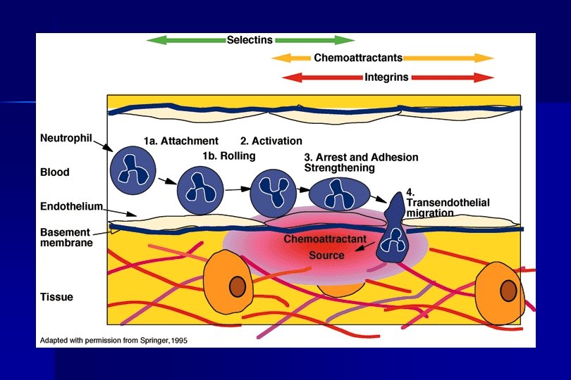 Cell Attachment and Rolling is Carbohydrate mediated • Requires expression of correct oligosaccharide • Terminal carbohydrate sequence found on protein and lipid • Weak monomeric affinity but fast Kon- and Koff-rates • Multimeric interactions increase affinity • Bonds have a low fractional spring slippage, which means that as the bond is subjected to strain it has a low tendency to break.