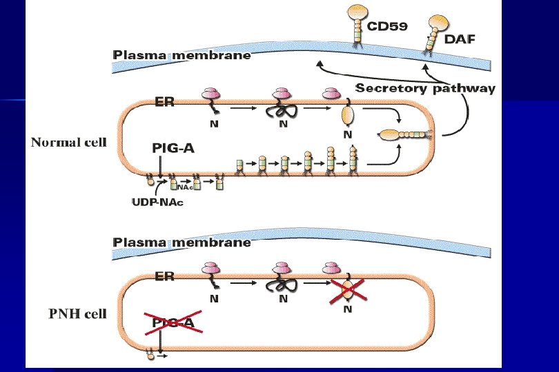 Mutations in Early GPI-anchor Biosynthesis • Mutations in the enzyme leads to a loss of all GPI-anchored proteins • Paroxysmal nocturnal haemoglobinurea • Intravascular haemolysis, cytopenia and thrombosis • Loss of GPI-anchored complement inactivating proteins in blood UDP-Glc. NAc UDP GPI-anchored proteins P Glc. NAc P Takeda & Kinoshita (1995), TIBS 20: 367