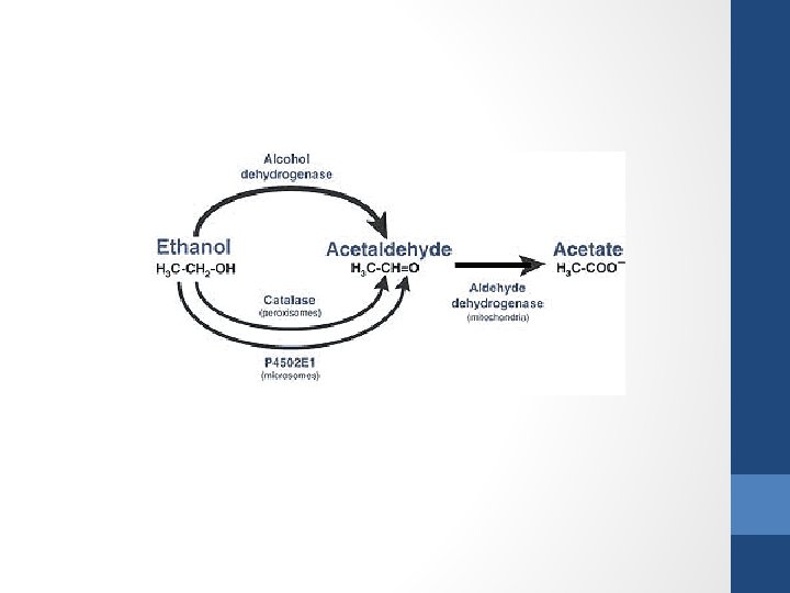 Metabolism of Alcohol • Alcohol is metabolized by several processes or pathways. • The most common of these pathways involves two enzymes— alcohol dehydrogenase (ADH) and aldehyde dehydrogenase (ALDH). • These enzymes help break apart the alcohol molecule, making it possible to eliminate it from the body. • First, ADH metabolizes alcohol to acetaldehyde, a highly toxic substance and known carcinogen. • Then, in a second step, acetaldehyde is further metabolized down to another, less active byproduct called acetate , which then is broken down into water and carbon dioxide for easy elimination.