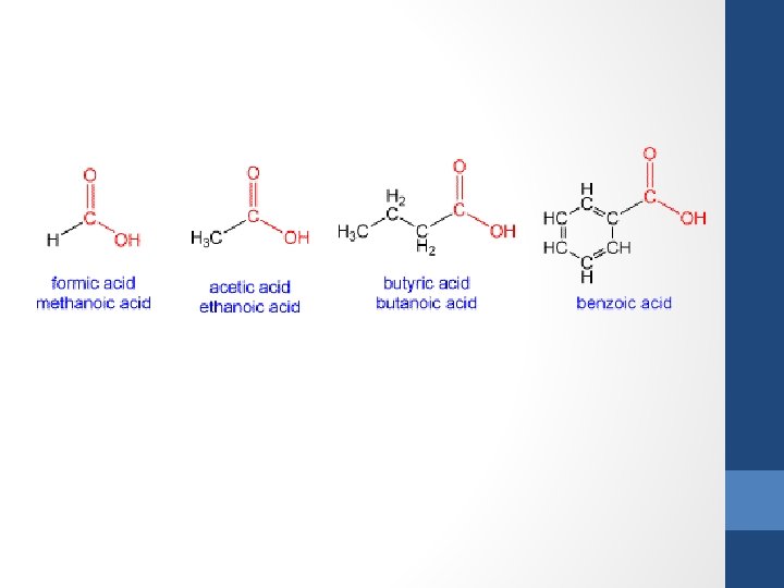Carboxylic Acids • Carboxylic acids are named by counting the number of carbons in the longest continuous chain including the carboxyl group and by replacing the suffix -ane of the corresponding alkane with -anoic acid. • If there are two -COOH groups, the suffix is expanded to include a prefix that indicates the number of -COOH groups present (-anedioic acid - there should not be more than 2 of these groups on the parent chain as they must occur at the ends). • It is not necessary to indicate the position of the -COOH group because this group will be at the end of the parent chain and its carbon is automatically assigned as C-1.
