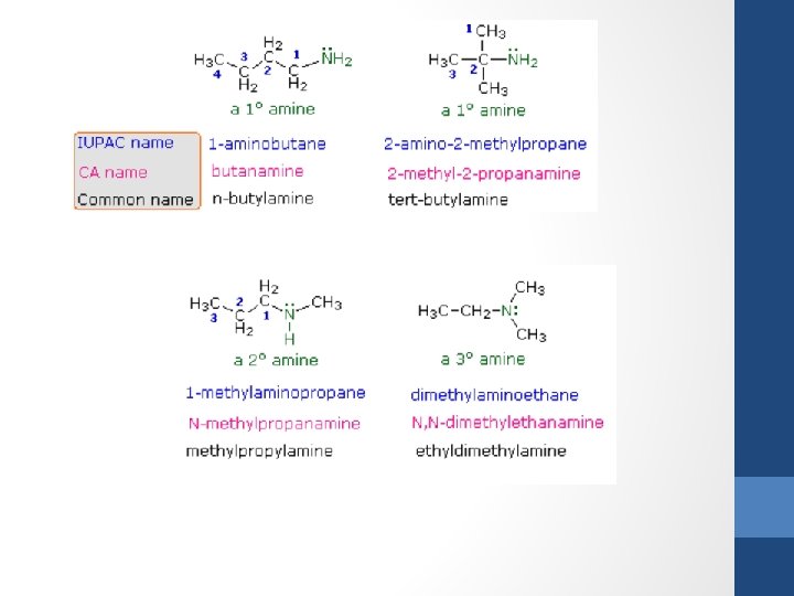 Amines • They are named like ethers, the alkyl (R) groups attached to the nitrogen are put in alphabetical order with no spaces between the names and these are followed by the word amine. The prefixes di- and tri- are used if two or three of the alkyl groups are the same.