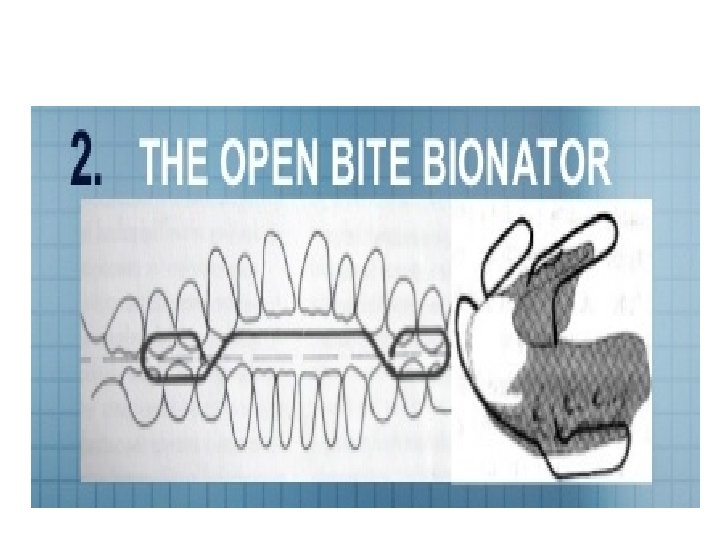 Open Bite Appliance This is used to inhibit abnormal posture and function of the tongue. The construction bite is kept as low as possible with acrylic bite blocks between the posterior teeth to prevent their extrusion. The acrylic portion of the lower lingual part extends onto /up to the upper incisor region as lingual shield, to prevent tongue movements. The palatal bar has the same configuration. The labial bow is quite similar with the exception that the wire runs approximately between the incisal edges