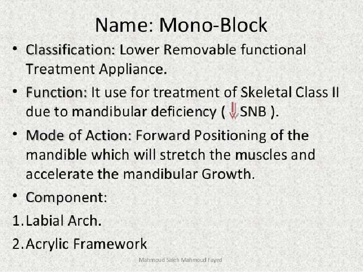 Definitive Treatment ü During growth usually all permanent teeth have erupted. ü Correction max-mand discrepancy. ü Usually followed by fixed appliance Treatment ü Functional appliance may also be used during fixed appliance treatment