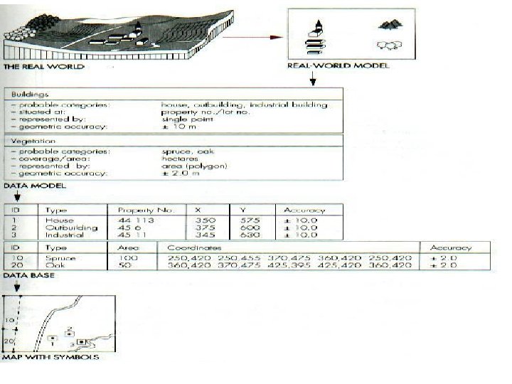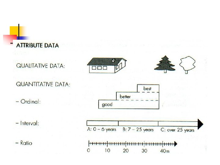 Modeling attribute data Each entity type may have one or more attributes n e. g. …buildings may have attributes characterizing material n For Example “masonry", "Wooden”, as well number of stories n Attributes may describe quantitative data ranked in three levels of accuracy