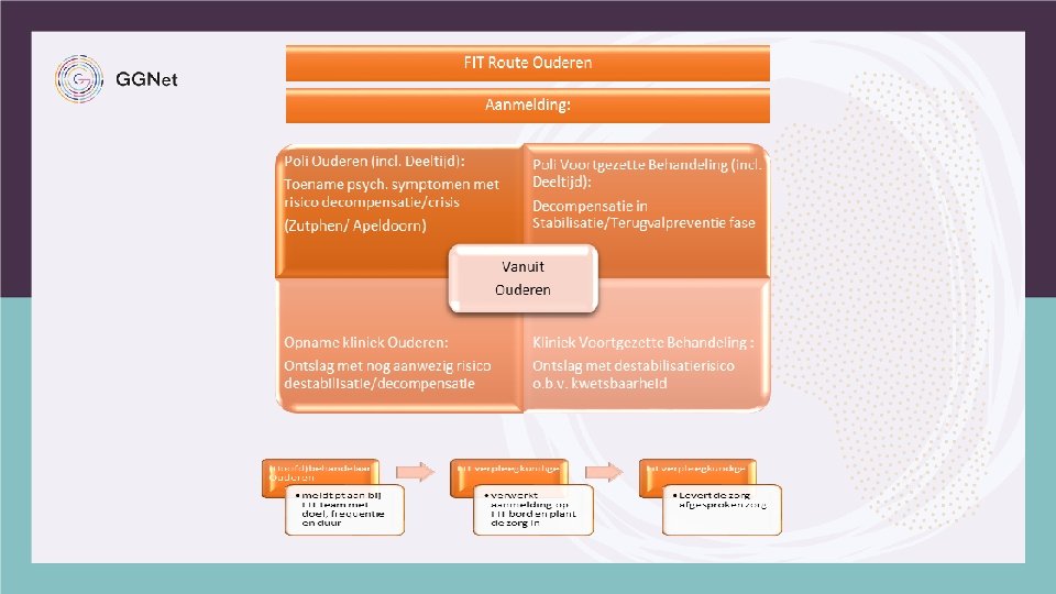 FIT, GGNET OUDEREN DOELSTELLINGEN: • Het voorkomen van crisis door vroegtijdige signalering, waardoor een opname niet noodzakelijk is. • Een crisis ombuigen waardoor een opname niet noodzakelijk is. • Het begeleiden van verlofmomenten en nazorg vanuit een klinische opname. • Afhankelijk van de regio kan FIT ook een rol spelen in de ondersteuning bij patiënten met langdurige instabiele problematiek, denk hierbij ook aan de zorgmijders.