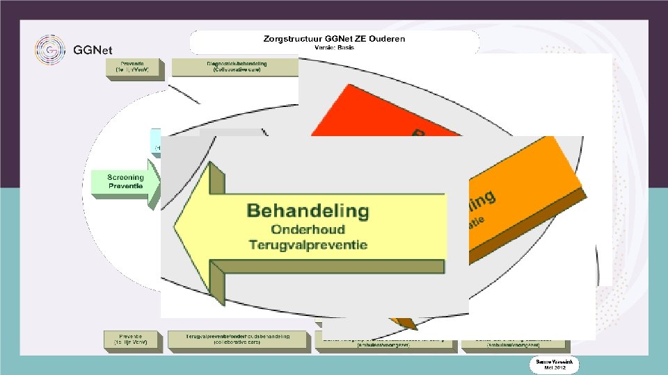 GGNET OUDEREN, ORGANISATIE EN VISIE • De behandelcyclus van de individuele patiënt is leidend • Er is een gedeelde verantwoordelijkheid voor de ingeschreven patiënten ongeacht waar de patiënt verblijft. • Aanbod van basis GGZ, specialistische GGZ en 3 e lijns diagnistiek en behandeling • Mogelijkheid tot opschalen van ambulante behandeling naar korte klinische opname tot voortgezette klinische behandeling. • Er wordt gewerkt vanuit een en hetzelfde zorgprogramma