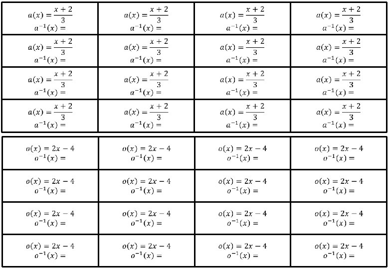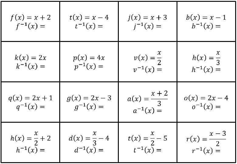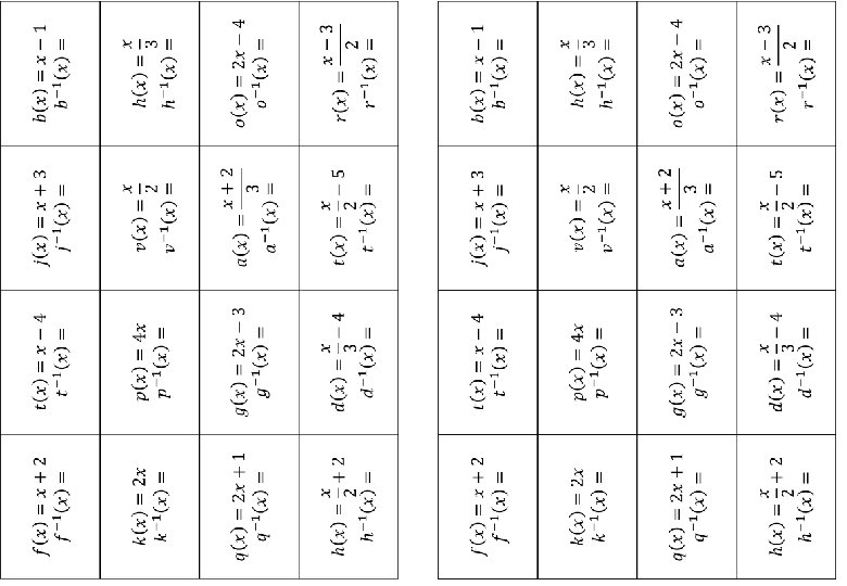 Functions – Inverse – Substitution – Chief Cards In this competitive activity groups (2+) input values into inverse functions to see who can get the highest score. The ‘Chief’ rolls a dice and decides whether the number is positive or negative, or calls an integer (− 5 to 5). ‘Quick Cut’ – Sets of cards can be easily guillotined to save time.